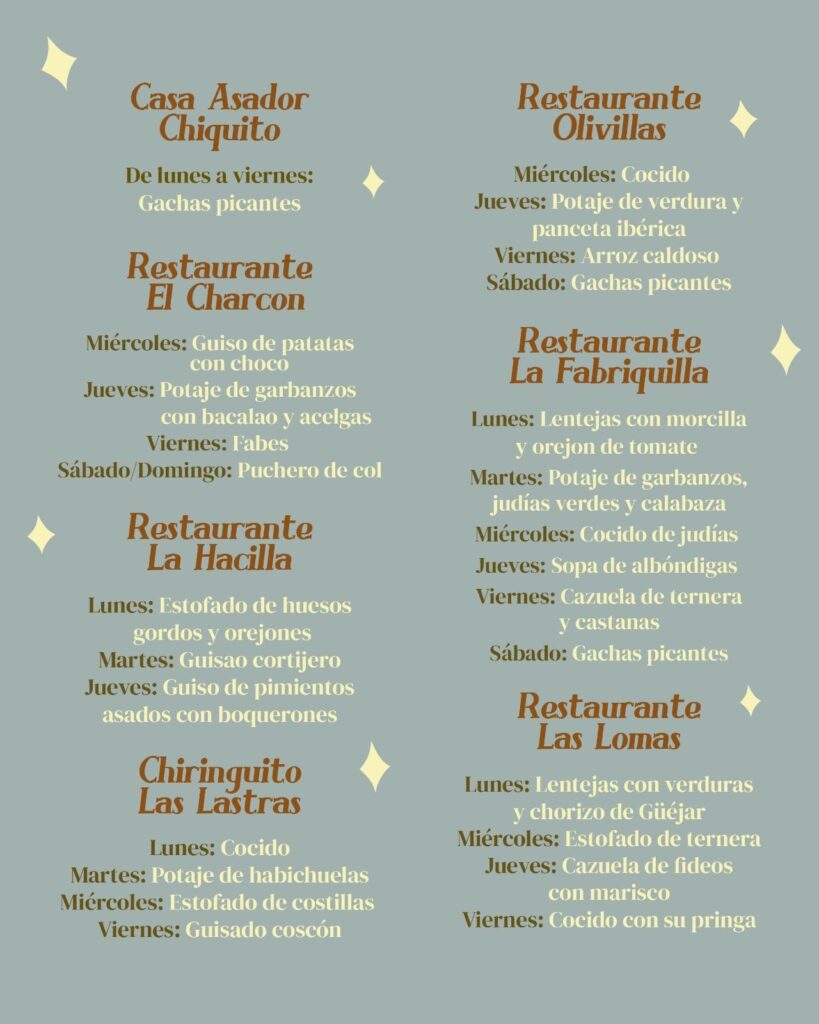 Así, durante las jornadas, cada restaurante o bar ofrecerá un guiso distinto según el día de la semana, apostando por recetas de antaño como el guisado coscón y el guisado cortijero o clásicos como las lentejas con morcilla güejareña y las gachas picantes.